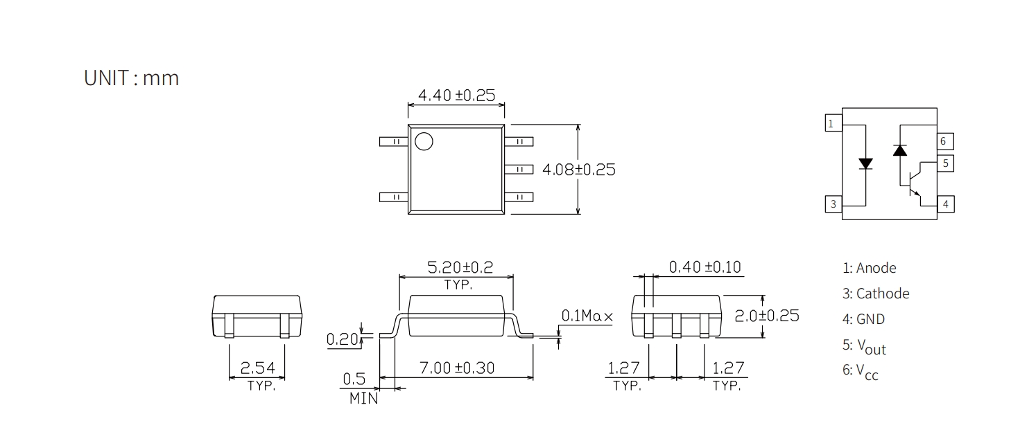 | Product | Package | size(LxWxHmm) | Data Transfer Rate (Mbps) | Supply Voltage(V) | tPHL(ns) | tPLH(ns) | IFT (mA) | CTR(%) | CMR(V/us) | Io(mA) | Topr (Min) (degC) | Topr (Max) (degC) | Viso (Vrms) |